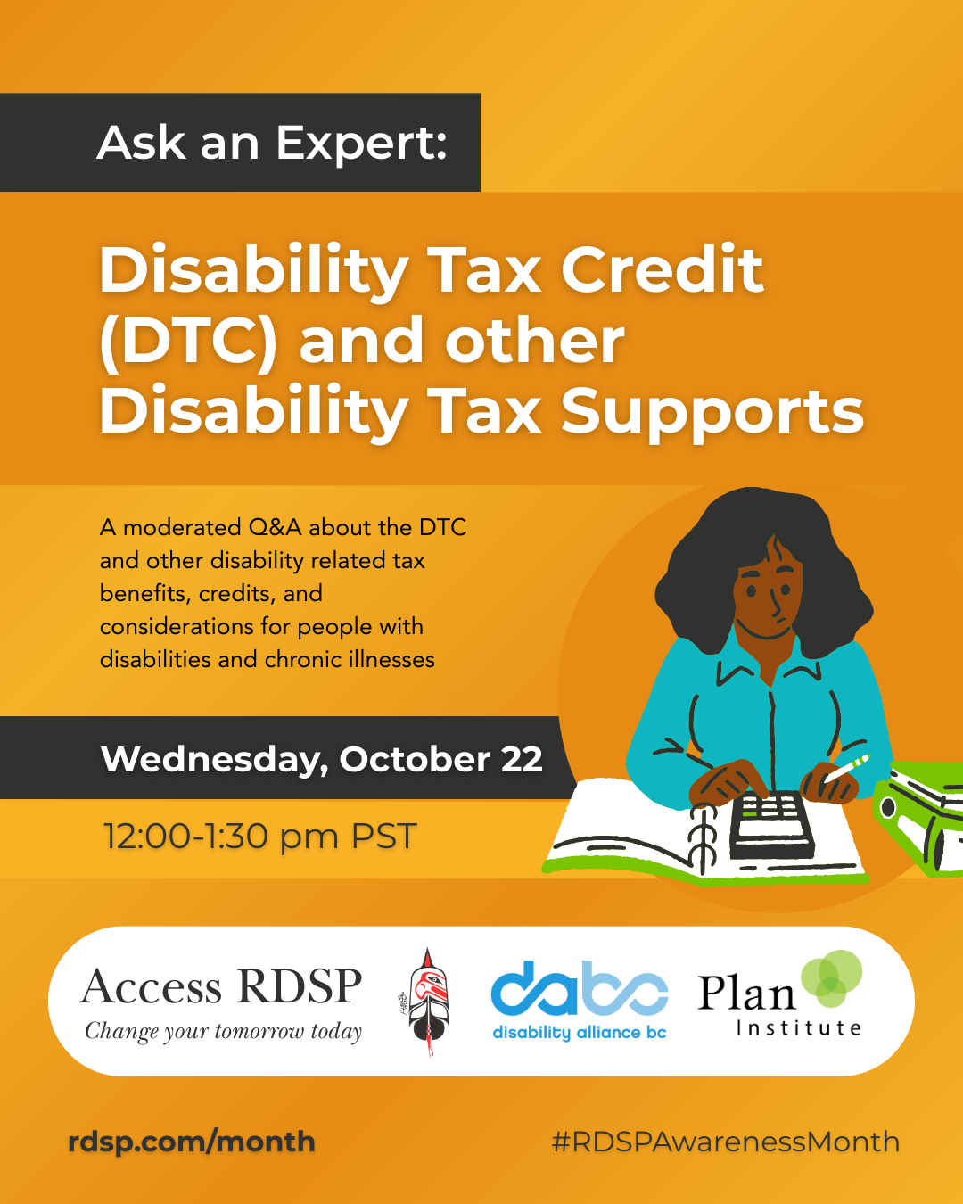The Access RDSP partnership between DABC, Plan Institute and BC Aboriginal Network on Disability Society (BCANDS) has had years of experience providing free navigational supports through income tax filing, the Disability Tax Credit (DTC), Registered Disability Savings Plan (RDSP) and other financial planning matters. For RDSP Awareness Month, our team of experts are hosting two “Ask an Expert” sessions, where you can learn and ask any question about the DTC, RDSP, taxes and other financial topics.
